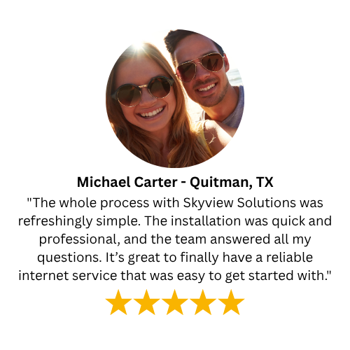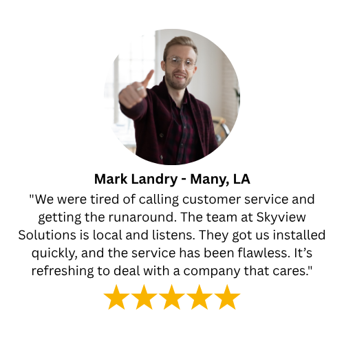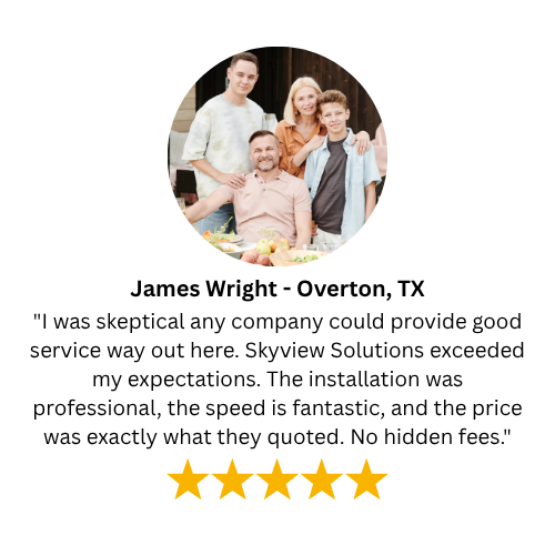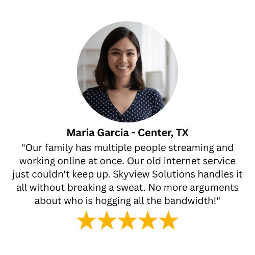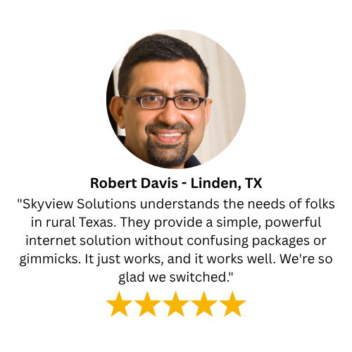 Imagine seamless streaming, effortless connection, and crystal-clear TV. Skyview Solutions makes it a reality. We bring game-changing speeds and reliable entertainment to rural homes in Texas, Oklahoma, and Louisiana. Experience the joy of seamless access, the relief of reliable connectivity, and the calm that comes with knowing your Internet and TV service just work.